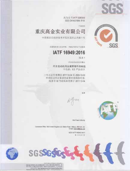 公司于2017年12月7日獲得ISO9001:2015和IATF16949:2016體系認證證書。